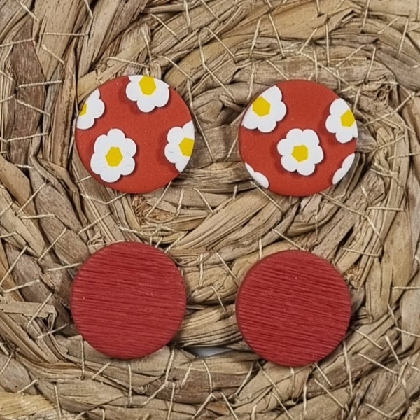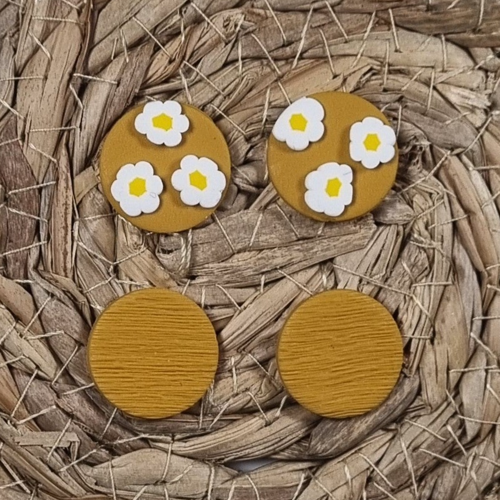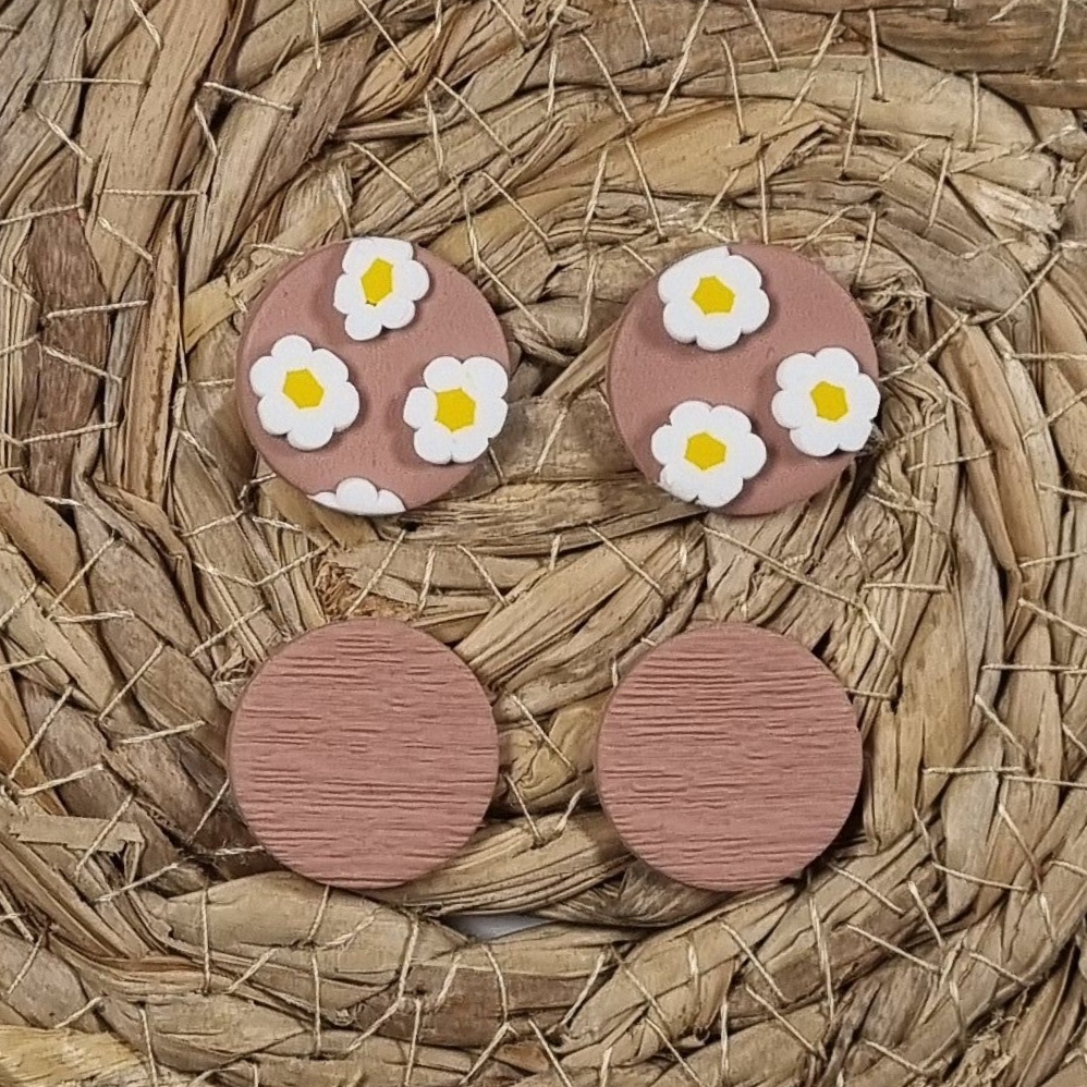 Studs set van twee paar ronde studs in de variant houtnerf en bloemen. Het perfecte formaat studs in een vrolijke en een neutrale uitvoering. Verkrijgbaar in zes verschillende voorjaars tinten.